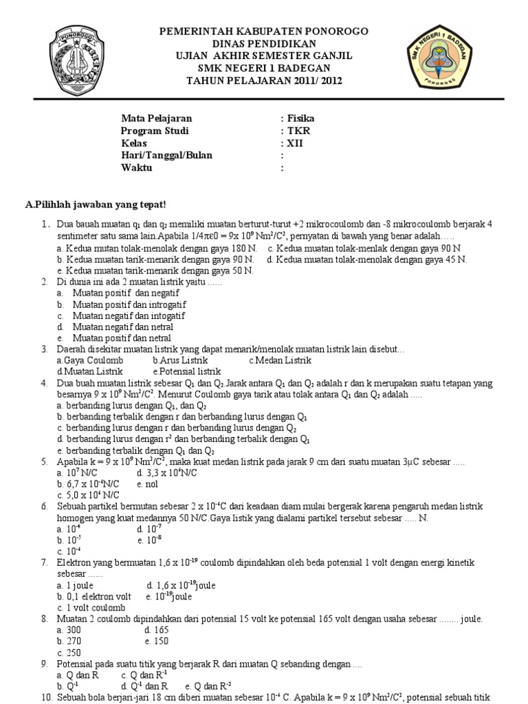 Sep 04 2020 Soal fisika kelas 10 11 12 semester 1 2 kurikulum 2013 terbaru doc untuk uas uts ukk intro pendidikan soal fisika kelas 10 semester 1 2 dan pembahasannya akan admin bagikan sebagai persiapan pas atau uas uts ukk tahun pelajaran 2018 2019 mendatang. Supaya nggak mepet dan keburu panik. Soal pada video kali ini merupakan soal Ujian Semester 2 Ula.